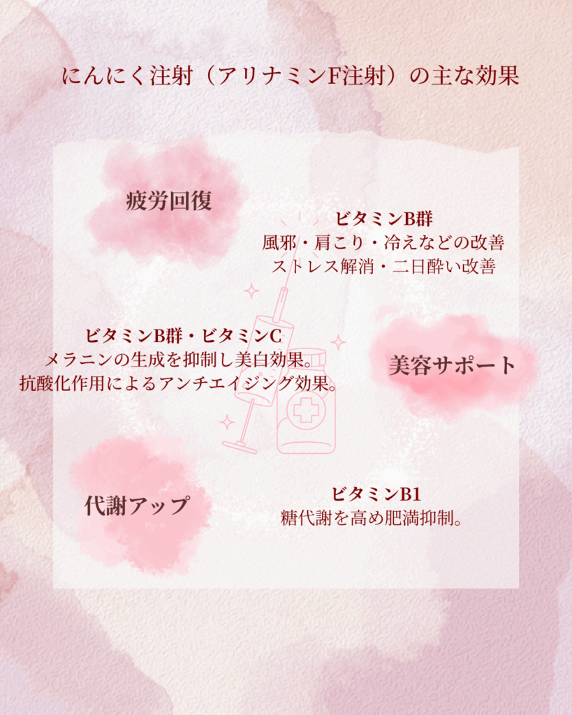 ニンニク注射は、忙しい毎日を送る方にとって「手軽に受けられる疲労回復・美容サポート」としてご好評いただいております。