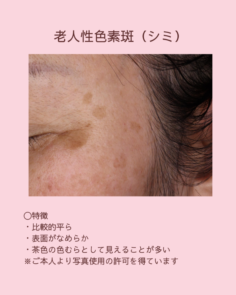 紫外線の影響などで生じる茶色い斑点で、比較的平らなことが多いのが特徴です。